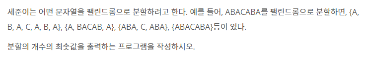 key point, 'ํฐ๋ฆฐ๋๋กฌ?' ๋ฌธ์ ๋ฅผ ํ์ฉ, d[i]๋ i๋ฒ์งธ๊น์ง ๋ฌธ์์ด์ ํฐ๋ฆฐ๋๋กฌ ๋ถํ ์ต์๊ฐ. DP
