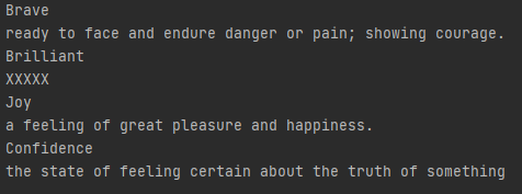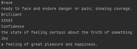 dictionary.put("Brave", "ready to face and endure danger or pain; showing courage.");
