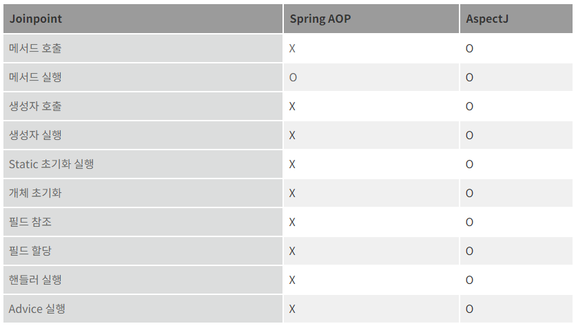 - ๋ฐ๋ผ์ Spring AOP๋ ๋ฉ์๋ ์คํ์๋ง JoinPoint๋ฅผ ์ง์ํ๋ค.
