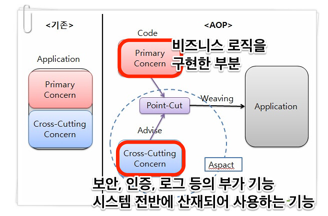 - AOP๋ ๋ถ๊ฐ๊ธฐ๋ฅ์ ์ ์คํฉํธ(Aspect)๋ก ์ ์ํ์ฌ, ํต์ฌ๊ธฐ๋ฅ์์ ๋ถ๊ฐ๊ธฐ๋ฅ์ ๋ถ๋ฆฌํจ์ผ๋ก์จ ํต์ฌ๊ธฐ๋ฅ์ ์ค๊ณํ๊ณ ๊ตฌํํ ๋ ๊ฐ์ฒด์งํฅ์ ์ธ ๊ฐ์น๋ฅผ ์งํฌ ์ ์๋๋ก ๋์์ฃผ๋ ๊ฐ๋ ์ด๋ค. (์ค๋ณต ์ ๊ฑฐ)