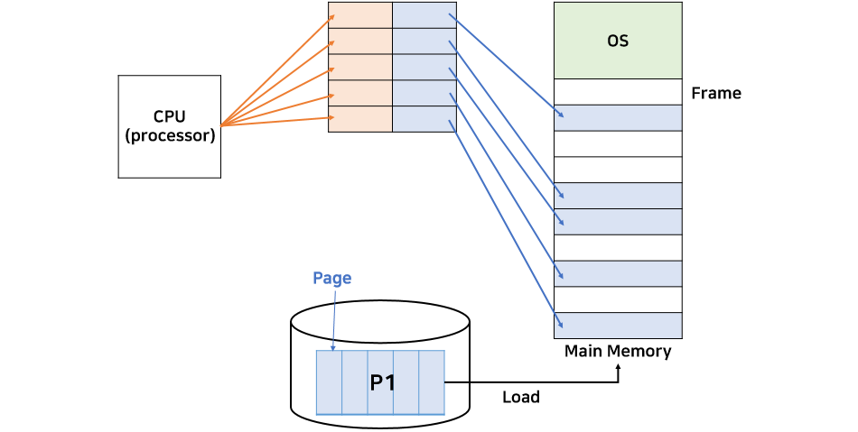 - ํ๋ก์ธ์ค์ ์ฃผ์ ๊ณต๊ฐ์ ๋์ผํ(๊ณ ์ ๋) ์ฌ์ด์ฆ์ ํ์ด์ง ๋จ์๋ก ๋๋์ด ๋ฌผ๋ฆฌ์ ๋ฉ๋ชจ๋ฆฌ์ ๋ถ์ฐ์์ ์ผ๋ก ์ ์ฅํ๋ ๋ฐฉ์