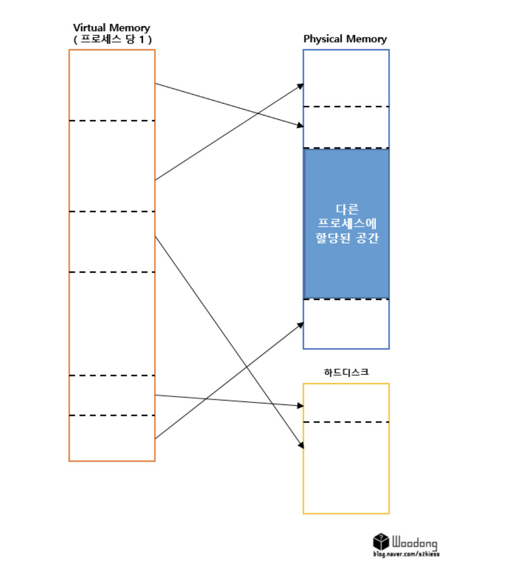 - ๊ฐ์ ๋ฉ๋ชจ๋ฆฌ๋ ๋ฉ๋ชจ๋ฆฌ์ ๋ก๋๋ ์ฆ, ์คํ์ค์ธ ํ๋ก์ธ์ค๊ฐ ๊ฐ์์ ๊ณต๊ฐ์ ์ฐธ์กฐํ์ฌ ๋ง์น ์ปค๋ค๋ ๋ฌผ๋ฆฌ ๋ฉ๋ชจ๋ฆฌ๋ฅผ ๊ฐ๊ณ ์๋ ๊ฒ์ฒ๋ผ ์ฌ์ฉํ ์ ์๋๋ก ํ๋ ๊ฒ์ด๋ค.