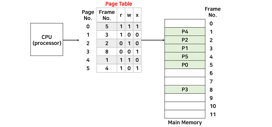 - CPU๋ ๋ ผ๋ฆฌ ์ฃผ์๋ก ํ๋ก๊ทธ๋จ์ด ์ค์ ํ๋๋ก ์ฐ์์ ์ธ ์ฃผ์๊ฐ์ผ๋ก ๋ช ๋ น์ ๋ด๋ฆฌ๊ณ ์ด๋ ๋ฉ๋ชจ๋ฆฌ๋ก ๊ฐ๊ธฐ ์ ์ ๊ฐ ํ์ด์ง์ ์ค์ ๋ฉ๋ชจ๋ฆฌ ์ฃผ์๊ฐ ์ ์ฅ๋์ด ์๋ ํ ์ด๋ธ์์ ๋ฌผ๋ฆฌ ์ฃผ์๋ก ๋ณ๊ฒฝ๋์ด์ผ ํ๋ค.