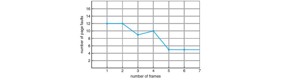 - Belady's Anomaly : ํ๋ ์ ์๊ฐ ์ฆ๊ฐํ๋ฉด(= ๋ฉ๋ชจ๋ฆฌ ์ฉ๋์ด ์ฆ๊ฐํ๋ฉด) page fault ์๊ฐ ์ค์ด๋๋ ๊ฒ์ด ์ ์์ ์ด์ง๋ง, ํน์ ํ ํ์ด์ง ์ฐธ์กฐ์ด์ ๋ํด์๋ ํ๋ ์ ์๊ฐ ์ฆ๊ฐํด๋ page fault ์๊ฐ ์คํ๋ ค ์ฆ๊ฐํ๋ ์ด์ ํ์์ด ๋ฐ์ํ๋ค. ์ด๋ฅผ Belady's Anomaly๋ผ ํ๋ค.