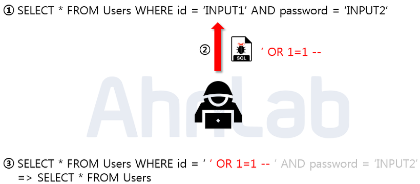 ํด์ปค์ ์ํด ์กฐ์๋ SQL ์ฟผ๋ฆฌ๋ฌธ์ด ๋ฐ์ดํฐ๋ฒ ์ด์ค์ ๊ทธ๋๋ก ์ ๋ฌ๋์ด ๋น์ ์์ ๋ช ๋ น์ ์คํ์ํค๋ ๊ณต๊ฒฉ ๊ธฐ๋ฒ